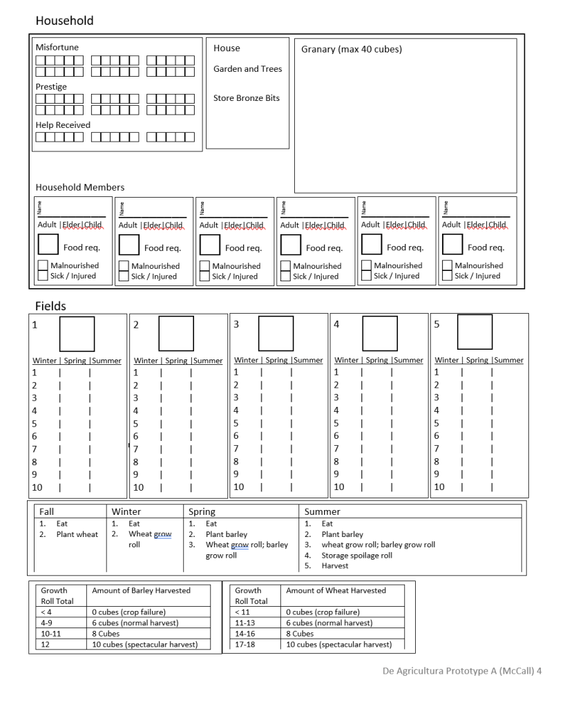 I wanted to design a game way to better introduce students to aspects of the subsistence farming life, preferably one that could be played reasonably quickly and without too much difficulty. More specifically, I want De Agricultura to illustrate (or better enable students to think about these points: