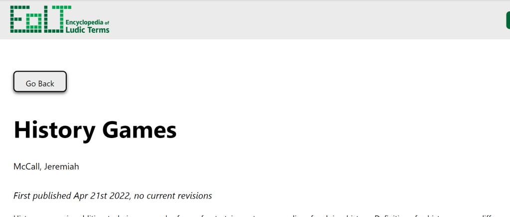 My encyclopedia article, an introduction to historical video games and historical game studies has just been published as part of the open-access online Encyclopedia of Ludic Terms