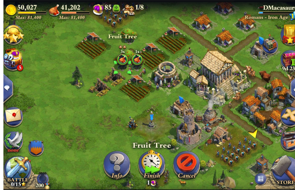 There tend to be a small number of standard resources in these games, two or three: often food, coins, and wood or stone. These are stored in stockpiles with finite capacities in the player agent’s settlement. Resources are sometimes gathered automatically by the civilization when the player is logged out; sometimes the player must log in to gather resources, a design technique to encourage players to regularly visit the game and keep up the player base. If the player agent’s resource stockpiles are full, all additional harvesting of those resources is stopped until the player logs in and spends the resources. So, for example, if the player-agent’s food stockpile is full, all additional incoming is wasted, a lost opportunity, and the player will need to log in and spend food on some project to avoid missing out on acquiring resources. Indeed the whole game is designed around real-world time consumption and players can decide whether they want to commit more real-world time to the game, logging in and playing more frequently, and, as the level up, waiting longer and longer times to construct more powerful buildings and armies, or purchasing special resources with real-world money to cut down on time.